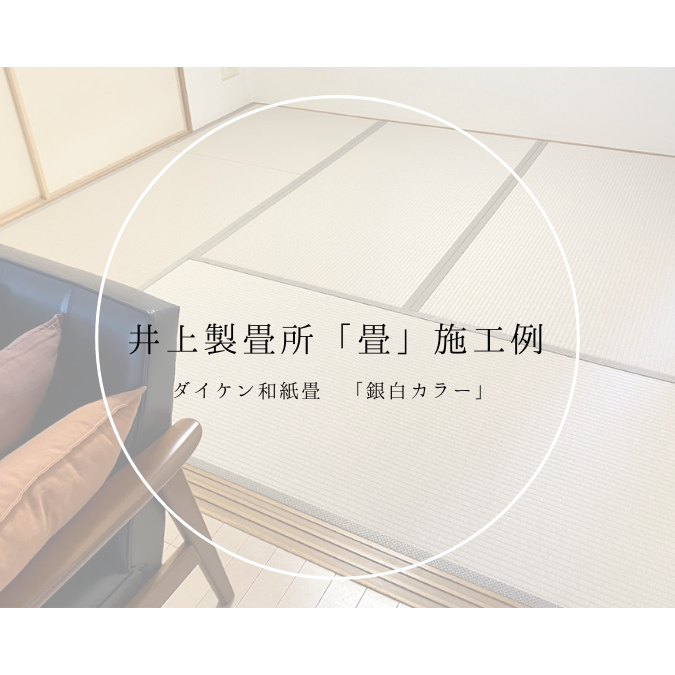 ○ ダイケン和紙畳 表替 畳表 : 「銀白 カラー 灰桜色」 畳縁 : オールウェイズ No52 (高田織物) 四畳半間 表替 価格 : 10,500円×4.5帖 47,250円 (税込) 畳シート 床掃除後に敷き込み 400円/帖