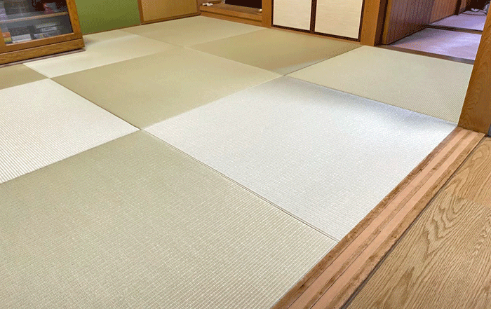 ○ ダイケン和紙畳 琉球畳 畳表 : 「清流カラー 若草色」 畳床 : ダイケン畳床 厚み:55o 六畳間 新調 価格 : 11,500円×12帖 138,000円 (税込) + 畳シート (床掃除後に畳シート敷き込み)