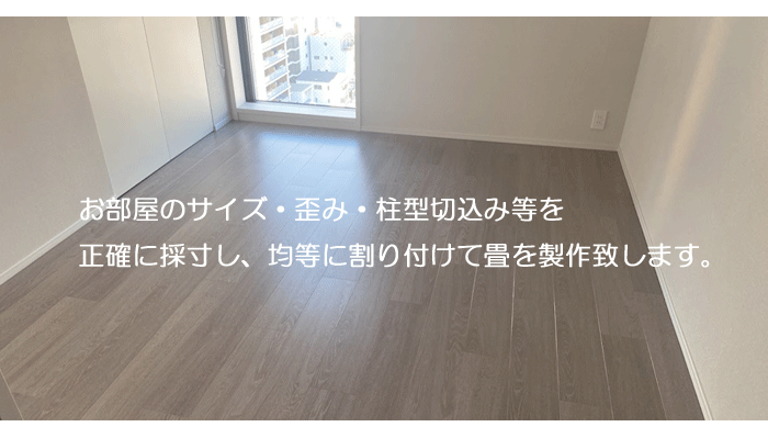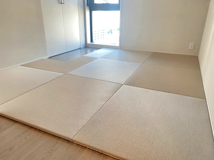 洋室・フローリングに畳を敷き込む仕様 ○ ダイケン和紙畳 琉球畳 新調 畳表 : 「清流 灰桜色」 畳床 : ダイケンT型畳床 厚み : 25o 洋室 四畳半間 価格 : 11,500円×9帖 103,500円 (税込) +変形切込み1ヶ所