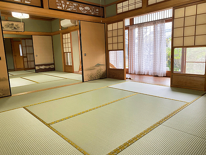 セキスイ 美草 「引目・グリーン」 畳縁 : 太閤 No300 (高田織物) 畳床 : ダイケン健やか畳床 「2000ECO」 本間サイズ 仕上厚み 55o ● 床の間 新調 ダイケン和紙表「床龍 大目」 × 高麗縁 金七宝