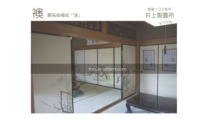 最高級襖紙 漣 〜さざなみ〜 徳川美術館コレクション ○ No53「香祥竹梅〜かしょうちくばい〜」 親和金使用 ○ 板戸/硝子入 : 香祥竹梅の原紙を使用 ○ 襖引き手 : 赤銅さざんか (鉄・真鍮)