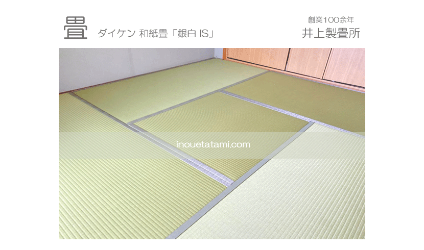 ○ ダイケン和紙畳 新調 表 : 銀白 IS 床 : ダイケン畳床 厚み : 55o 縁 : 高田織物 「オールウェイズNo61」 四畳半間 本間サイズ 新調 +柱型切込み +畳シート (床掃除後に敷き込み)