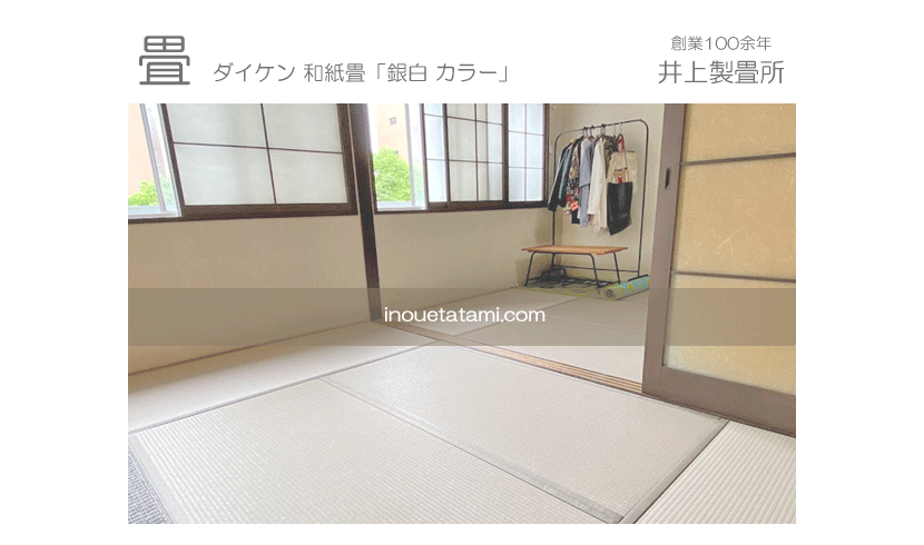 ○ ダイケン和紙畳 新調 畳表 : 銀白 カラー 灰桜色」 畳縁 : オールウェイズ No62 (高田織物) 畳床 : ダイケン畳床 厚み:55o 六帖間×二部屋 新調 16,000円 × 12帖 192,000円 (税込) +畳シート