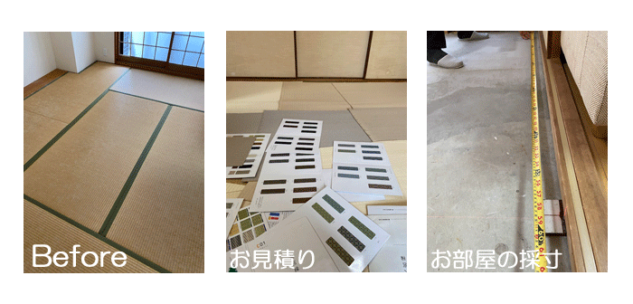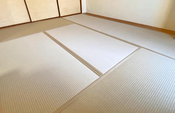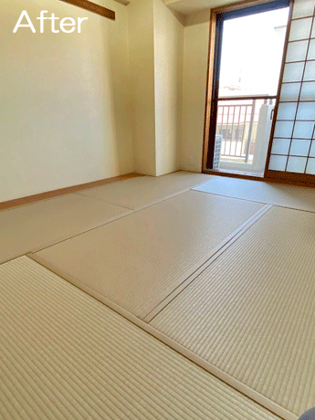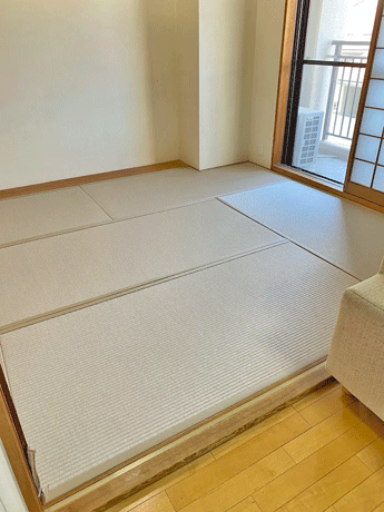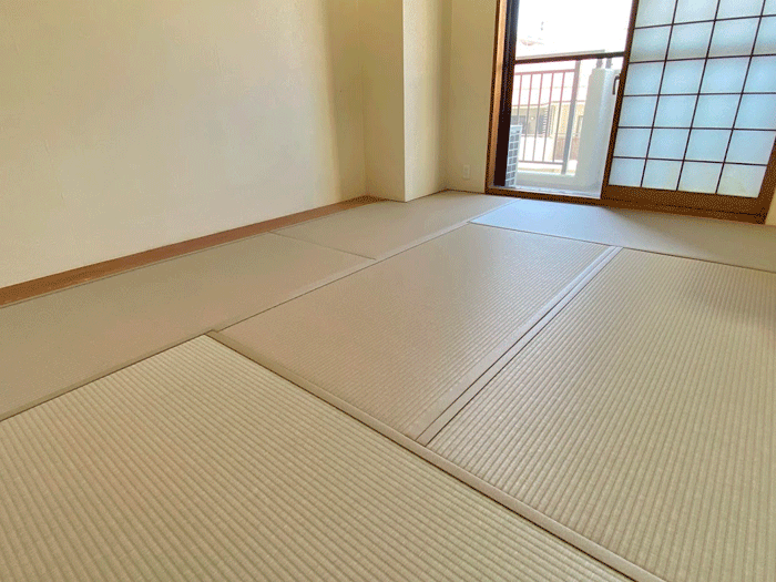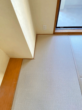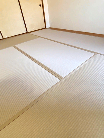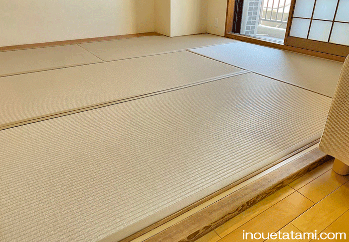 ○ ダイケン和紙畳 新調 畳表 : 銀白カラー 灰桜色 畳縁 : ストリーム No15 (高田織物) 畳床 : ダイケン畳床 厚み : 55o 六畳間 新調 16,000円 × 6帖 96,000円 (税込) + 柱型切込み 1ヶ所
