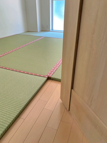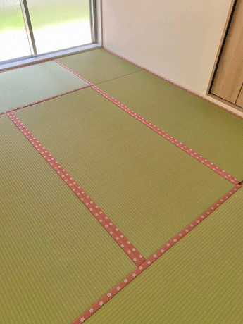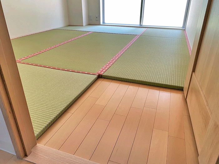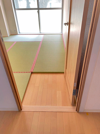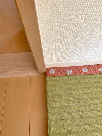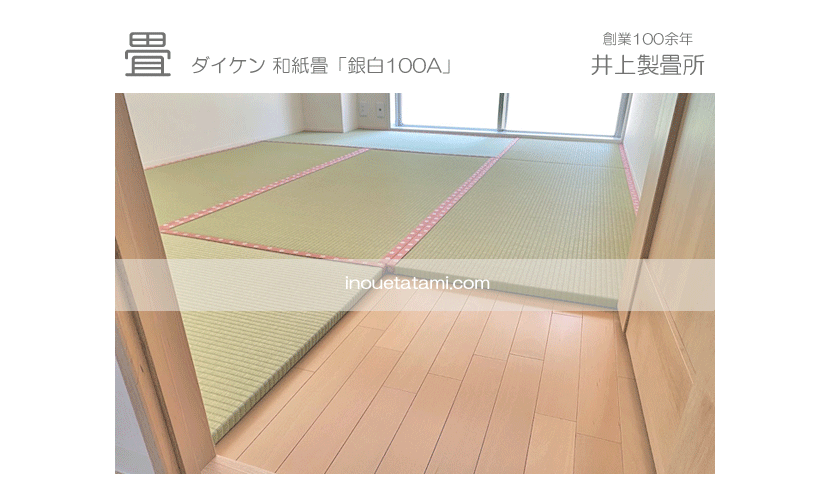 「洋室のフローリングに畳を敷き込む仕様」 ○ ダイケン和紙畳 新調 畳表 : 銀白100A 銀白色 畳縁 : HANA香織V No6 桜 (高田織物) 畳床 : ダイケン畳床 厚み : 30o 六畳間 新調 15,500円 × 5.5帖 85,250円 (税込) + 柱型切込み