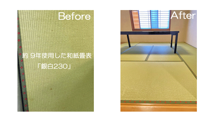 ![]() 裏返し:数年使用した畳表の裏面を(裏返して)使用し張り直しすることです。 ※畳縁は新調します。 ※ダイケン和紙畳表は「表面」にキズ・シミ・汚れが有る場合でも、 |