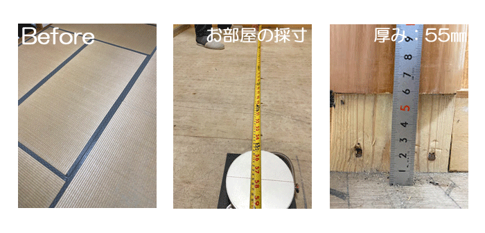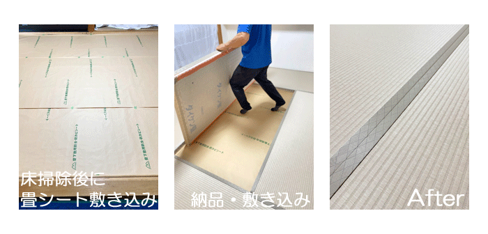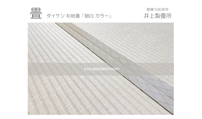 ○ ダイケン和紙畳 新調 畳表 : 「銀白 カラー 灰桜色」 畳床 : ダイケン畳床 畳縁 : オールウェイズ No22 (高田織物) 厚み : 55o 価格 : 16,000円 × 6帖 96,000円 (税込) 畳シート 400円/帖