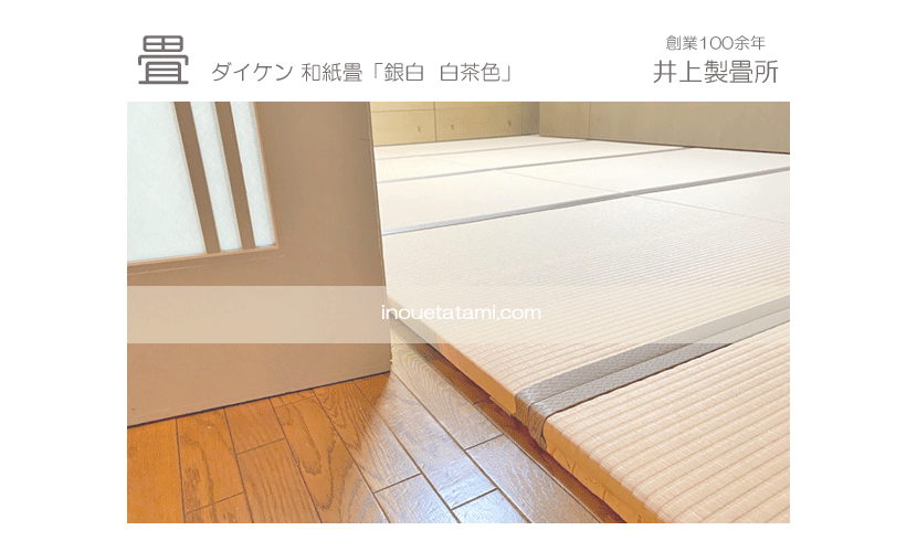 洋室・フローリングに畳を敷き込む仕様 ○ ダイケン和紙畳 表替 畳表 : 銀白カラー 白茶色 畳縁 : オールウェイズ No32 (高田織物) 厚み : 55o 十畳半間 表替 価格 : 10,500円 × 10.5帖 110,250円 (税込) + 変形切込み 500円