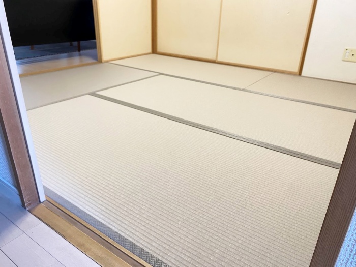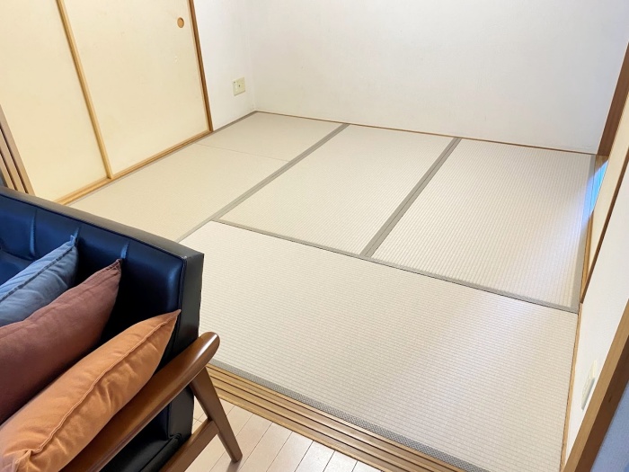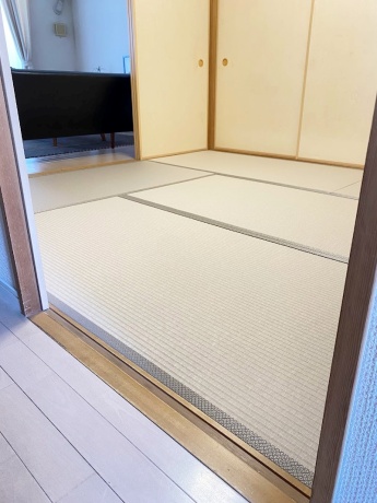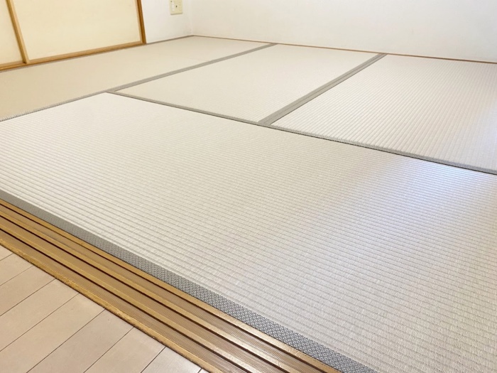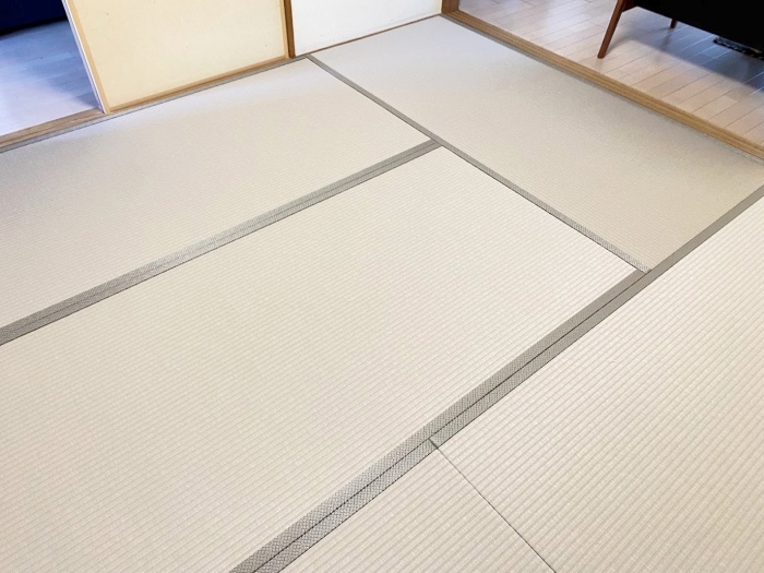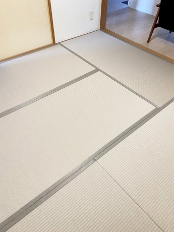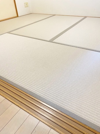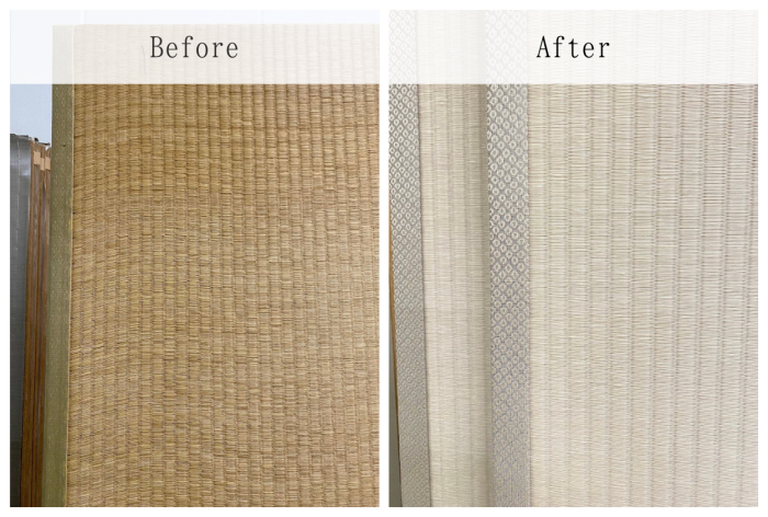 ○ ダイケン和紙畳 表替 畳表 : 「銀白 カラー 灰桜色」 畳縁 : オールウェイズ No52 (高田織物) 四畳半間 表替 価格 : 10,500円×4.5帖 47,250円 (税込) 畳シート 床掃除後に敷き込み 400円/帖