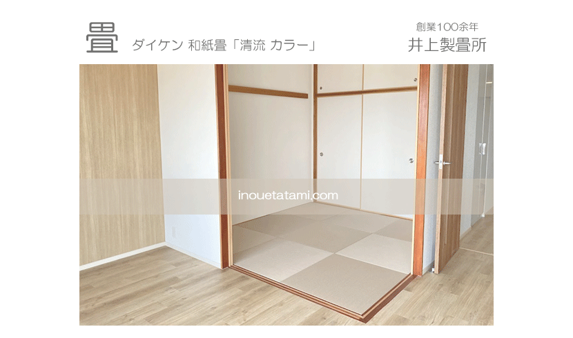 ○ ダイケン和紙畳 琉球畳 畳表 : 「清流カラー 灰桜色」 畳床 : ダイケン畳床 厚み:30o 四畳半間 新調 価格 : 11,500円×9帖 103,500円 (税込) + 畳シート (床掃除後に畳シート敷き込み)