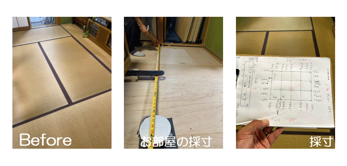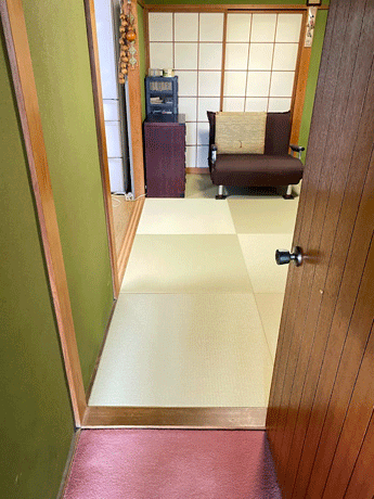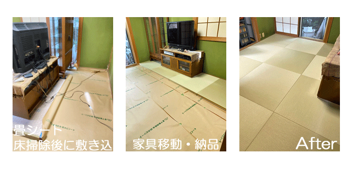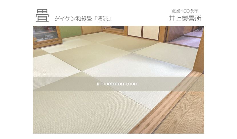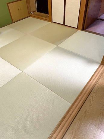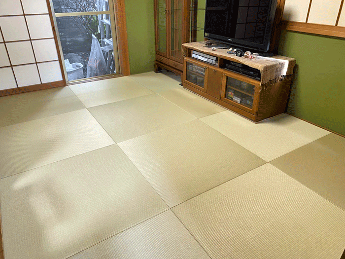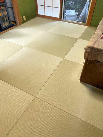 ○ ダイケン和紙畳 琉球畳 畳表 : 「清流カラー 若草色」 畳床 : ダイケン畳床 厚み:55o 六畳間 新調 価格 : 11,500円×12帖 138,000円 (税込) + 畳シート (床掃除後に畳シート敷き込み)