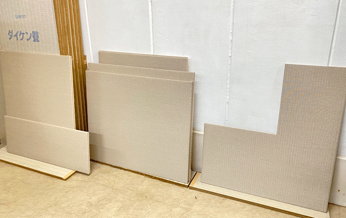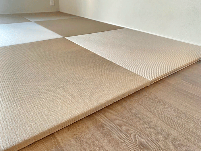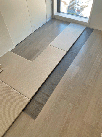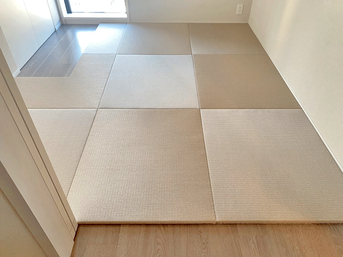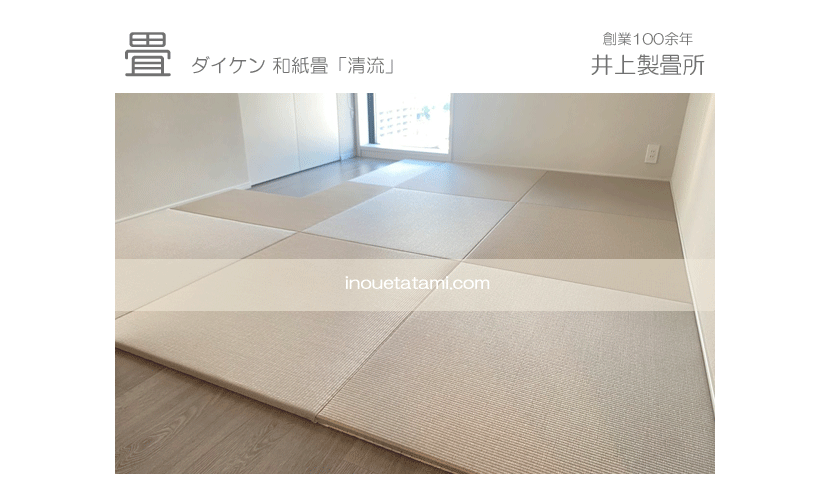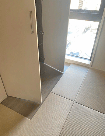 洋室・フローリングに畳を敷き込む仕様 ○ ダイケン和紙畳 琉球畳 新調 畳表 : 「清流 灰桜色」 畳床 : ダイケンT型畳床 厚み : 25o 洋室 四畳半間 価格 : 11,500円×9帖 103,500円 (税込) +変形切込み1ヶ所