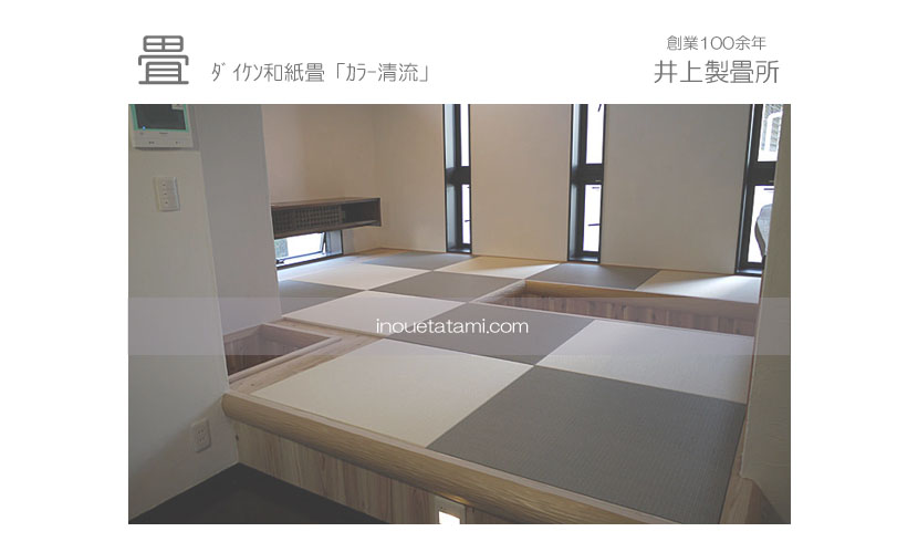 ○ ダイケン和紙畳 カラー組合せ仕様 「カラー清流 銀鼠色 × 乳白色」 20o 仕上 薄畳仕様 1,500円増し/帖 新調 13,000円 × 12帖 156,000円 ○ ダイケン和紙畳 「銀白」 新調 14,500円 × 6帖 87,000円
