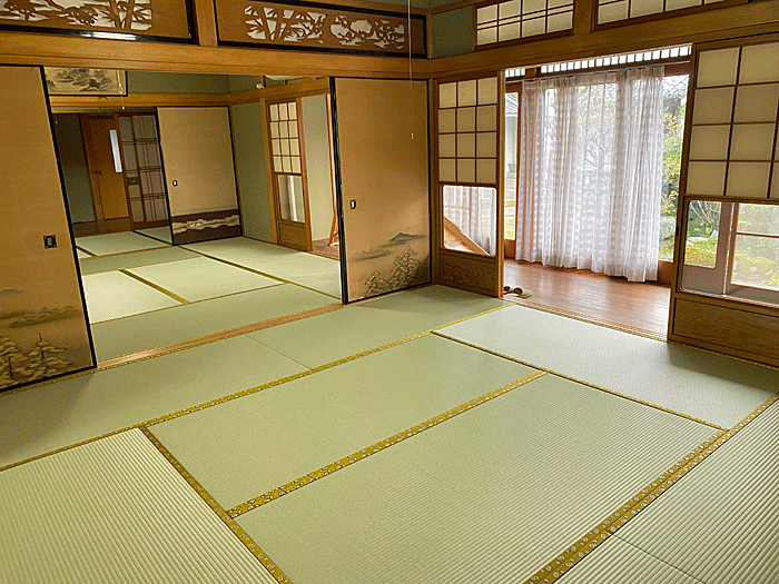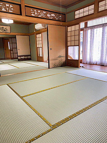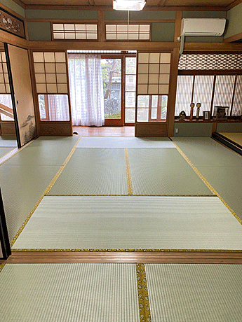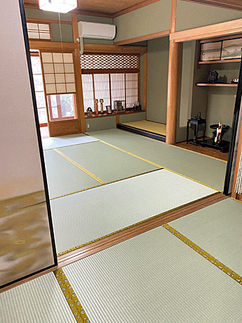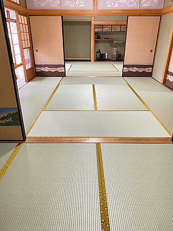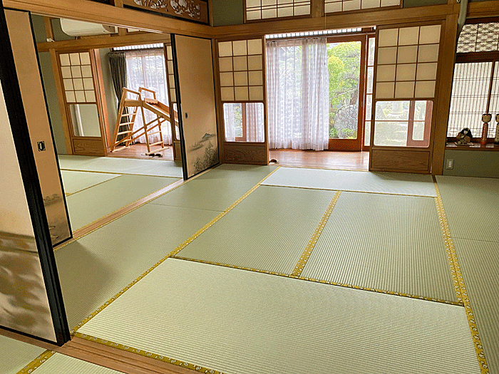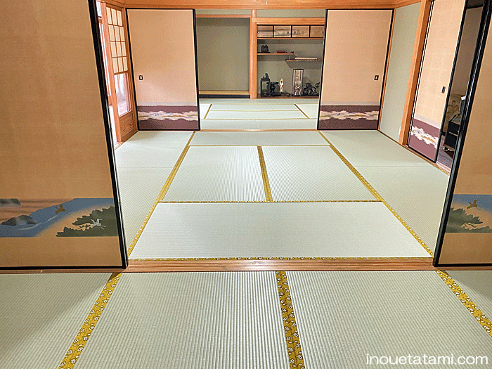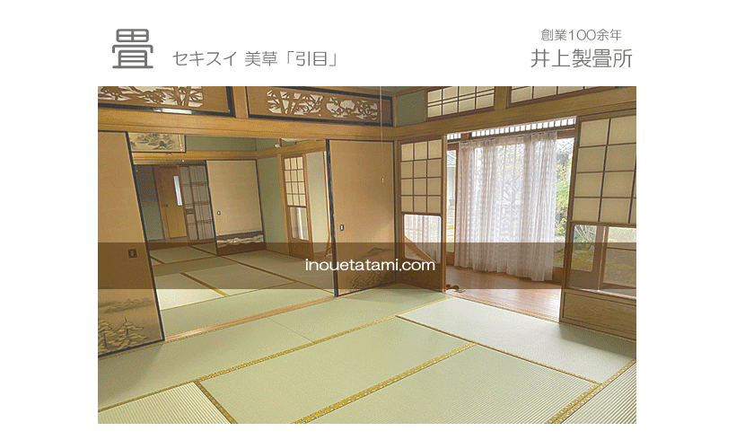セキスイ 美草 「引目・グリーン」 畳縁 : 太閤 No300 (高田織物) 畳床 : ダイケン健やか畳床 「2000ECO」 本間サイズ 仕上厚み 55o ● 床の間 新調 ダイケン和紙表「床龍 大目」 × 高麗縁 金七宝